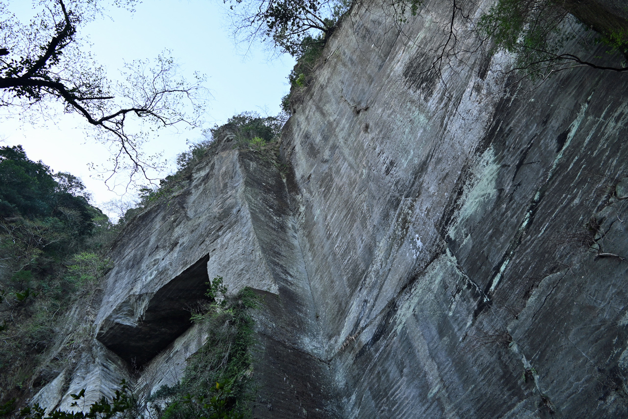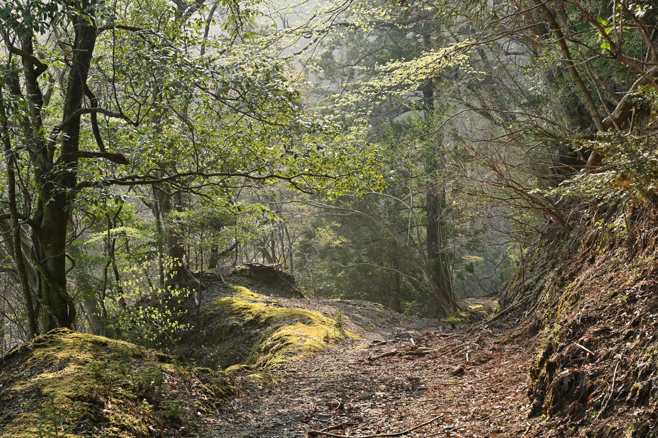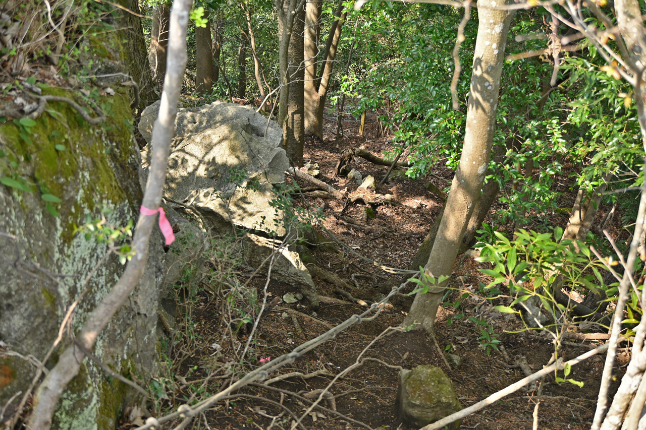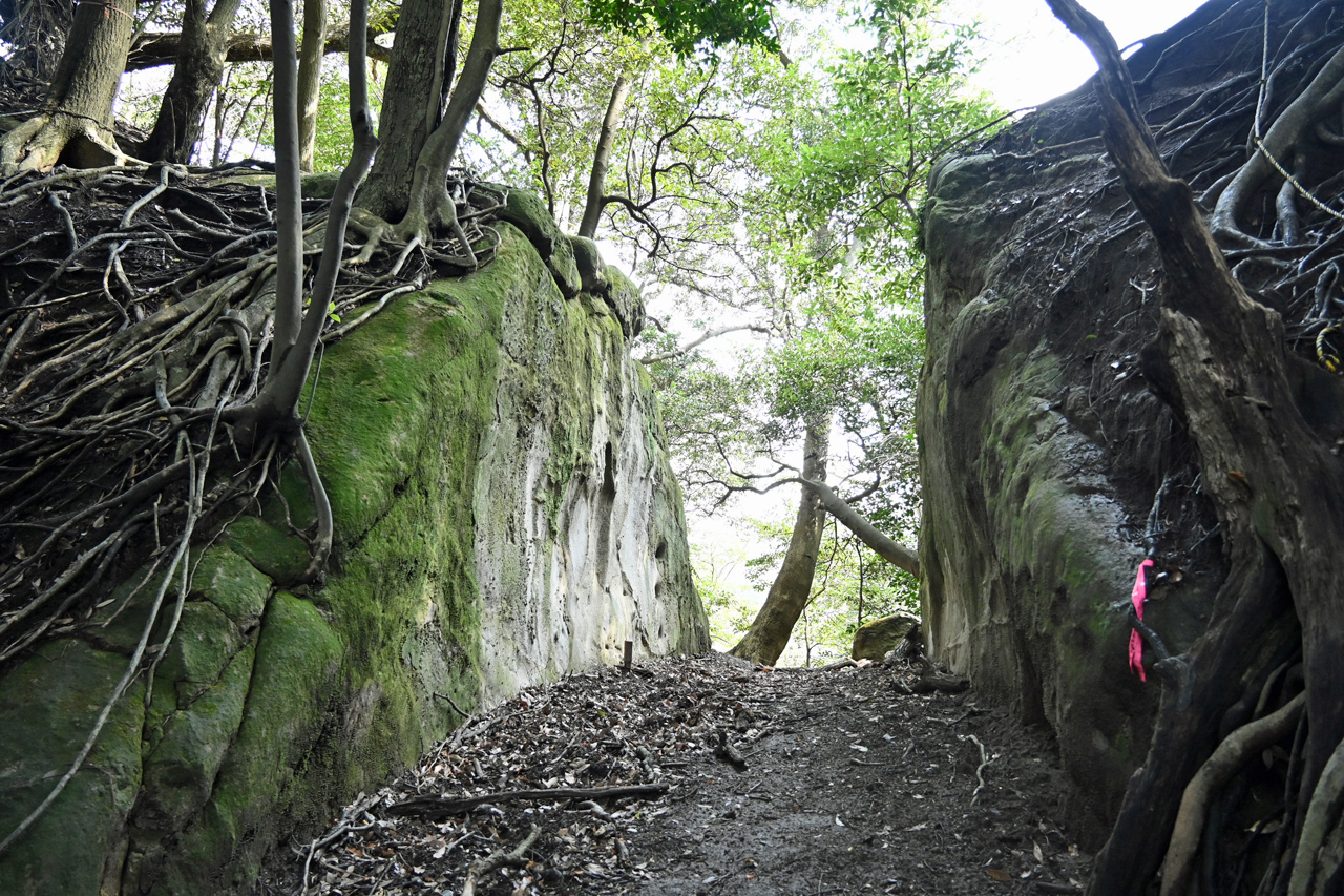 山中に忽然と切通し出現 このあたりもかつては石切りをしていたのだろうか