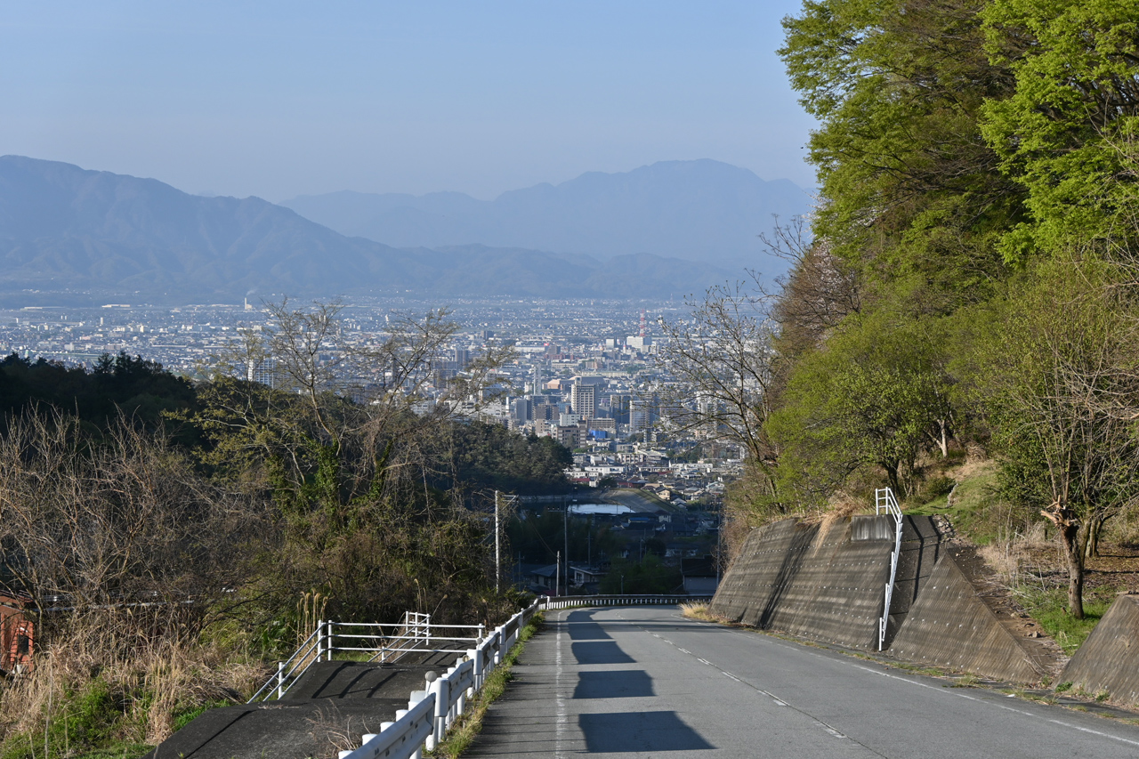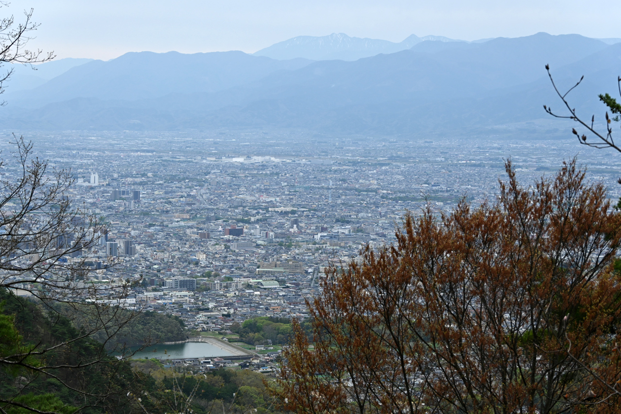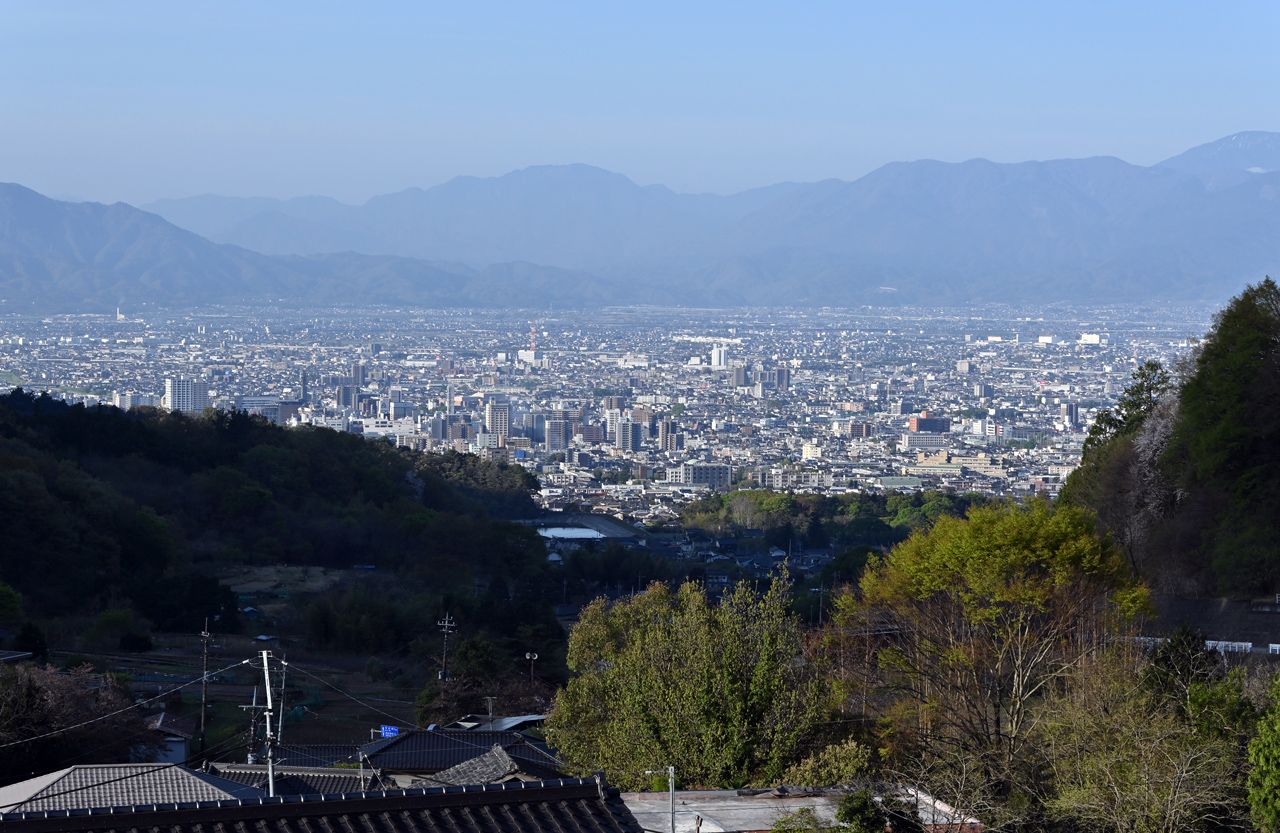 不動明王の見つめる先は甲府市街地 左手前に躑躅ヶ崎(武田神社)脇の竜華池が見える