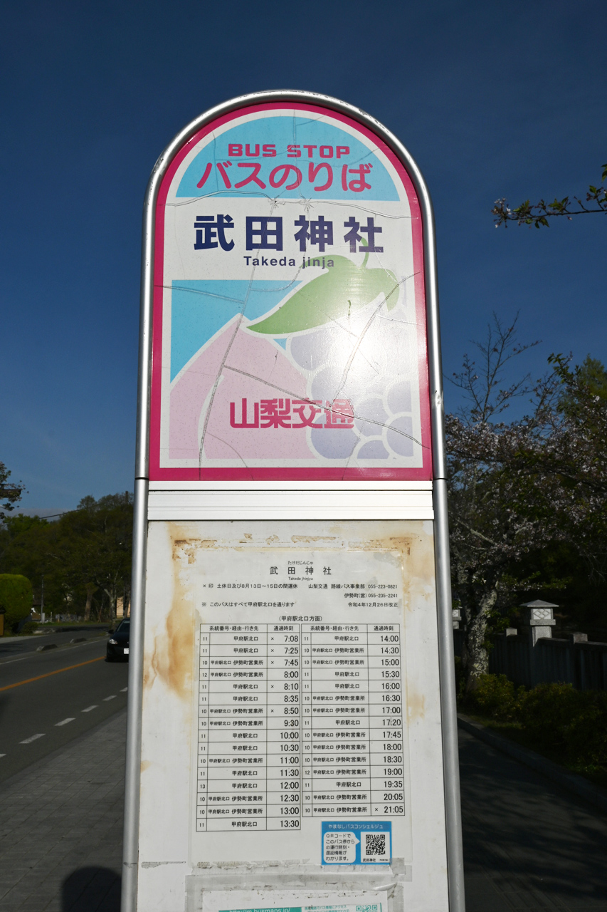 武田神社のバス停でタイミングよくバス待ち数分 最後まで歩かずに済んだ 車を置いた積翠寺町にもバスは来ているが始発が遅いのに比べて市内線は便数も豊富