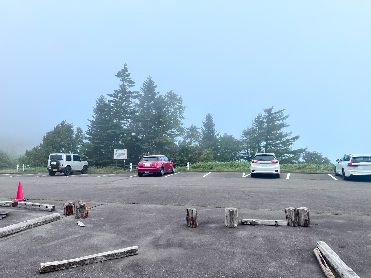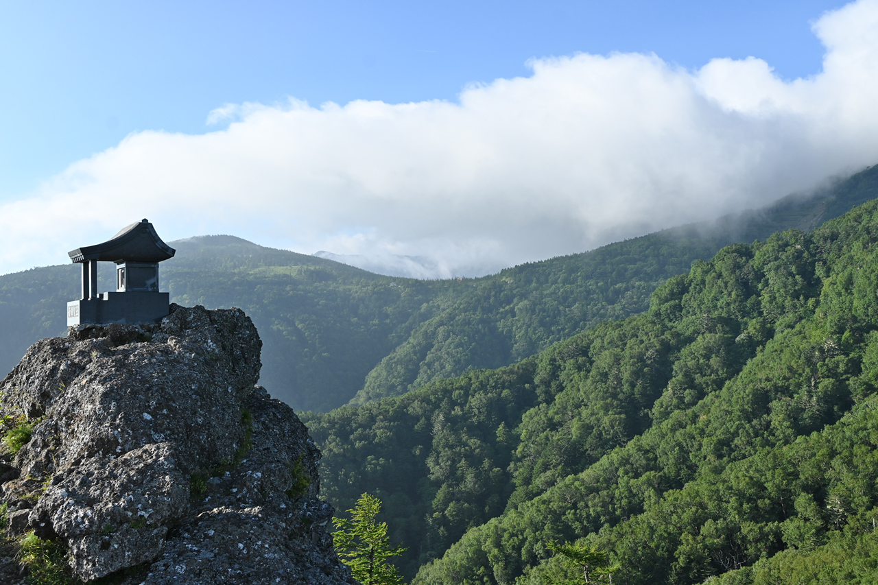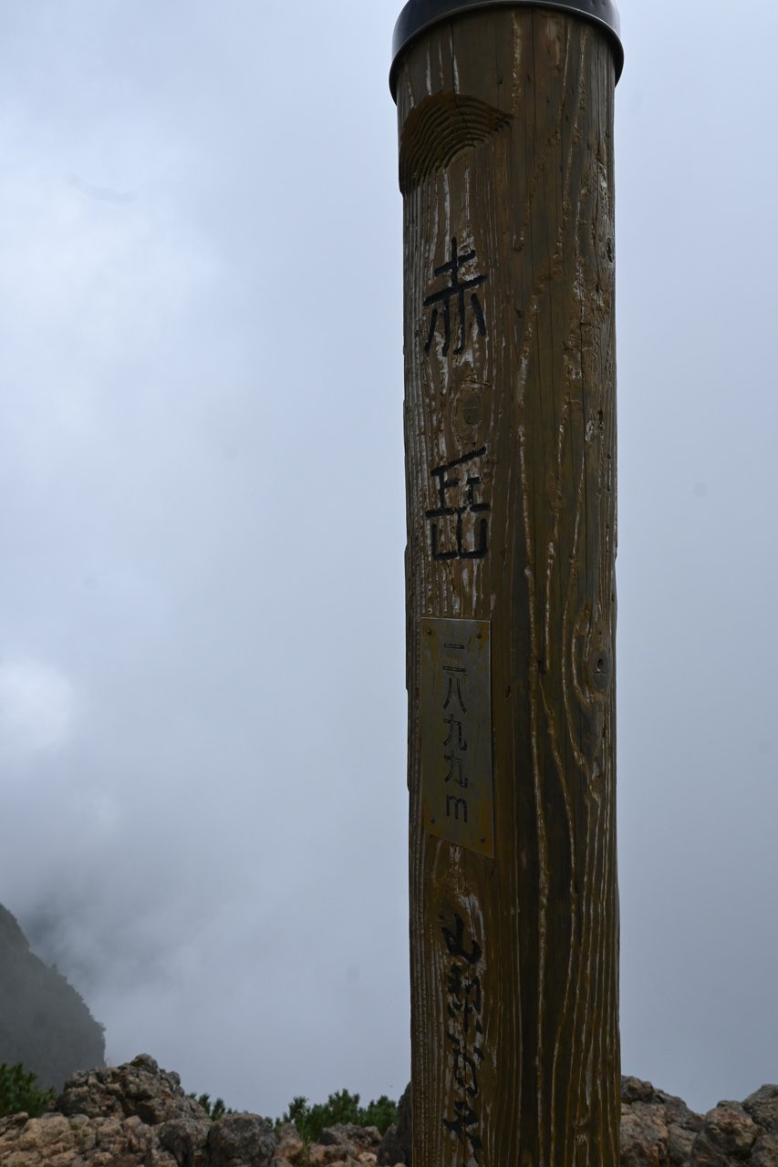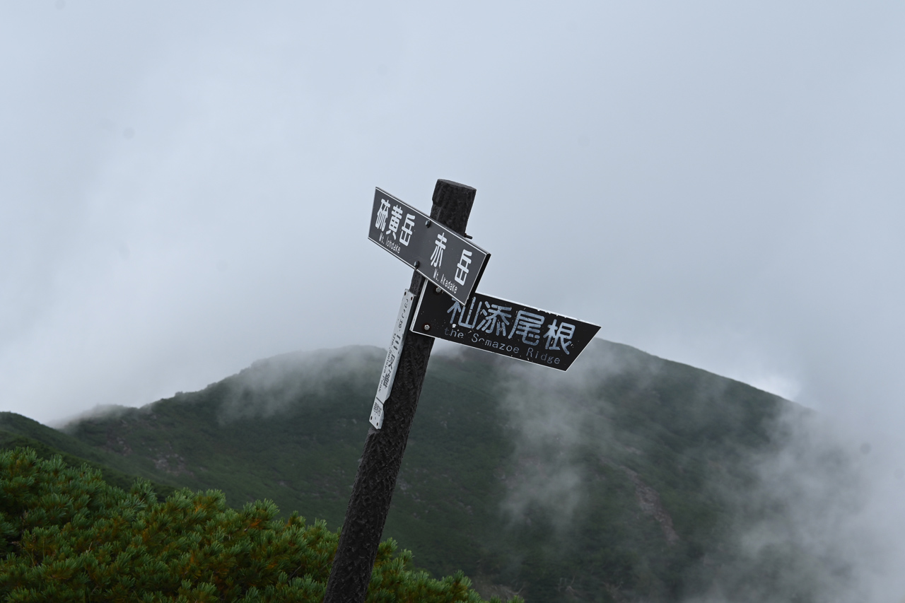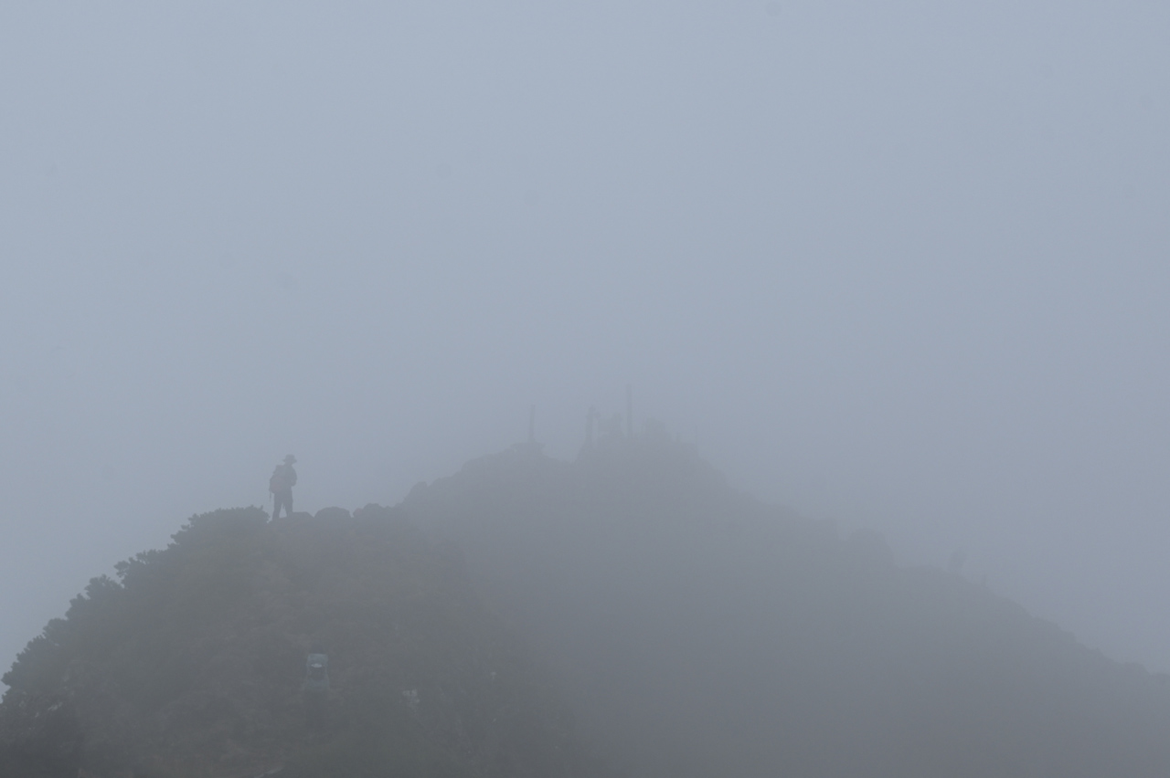 上空は青空が見え、光も差し込んでなんとか間に合ったかと思いきや、大岳山頂は陸奥湾から吹き上げてくるガスが視界を遮っていました。
