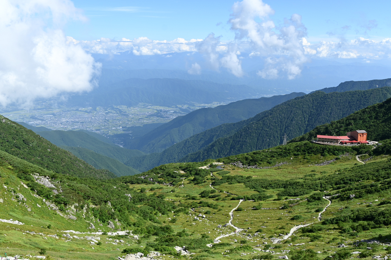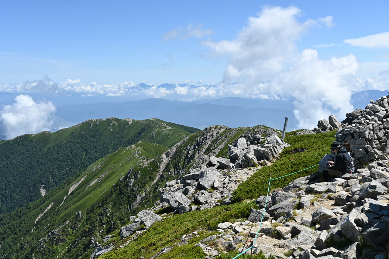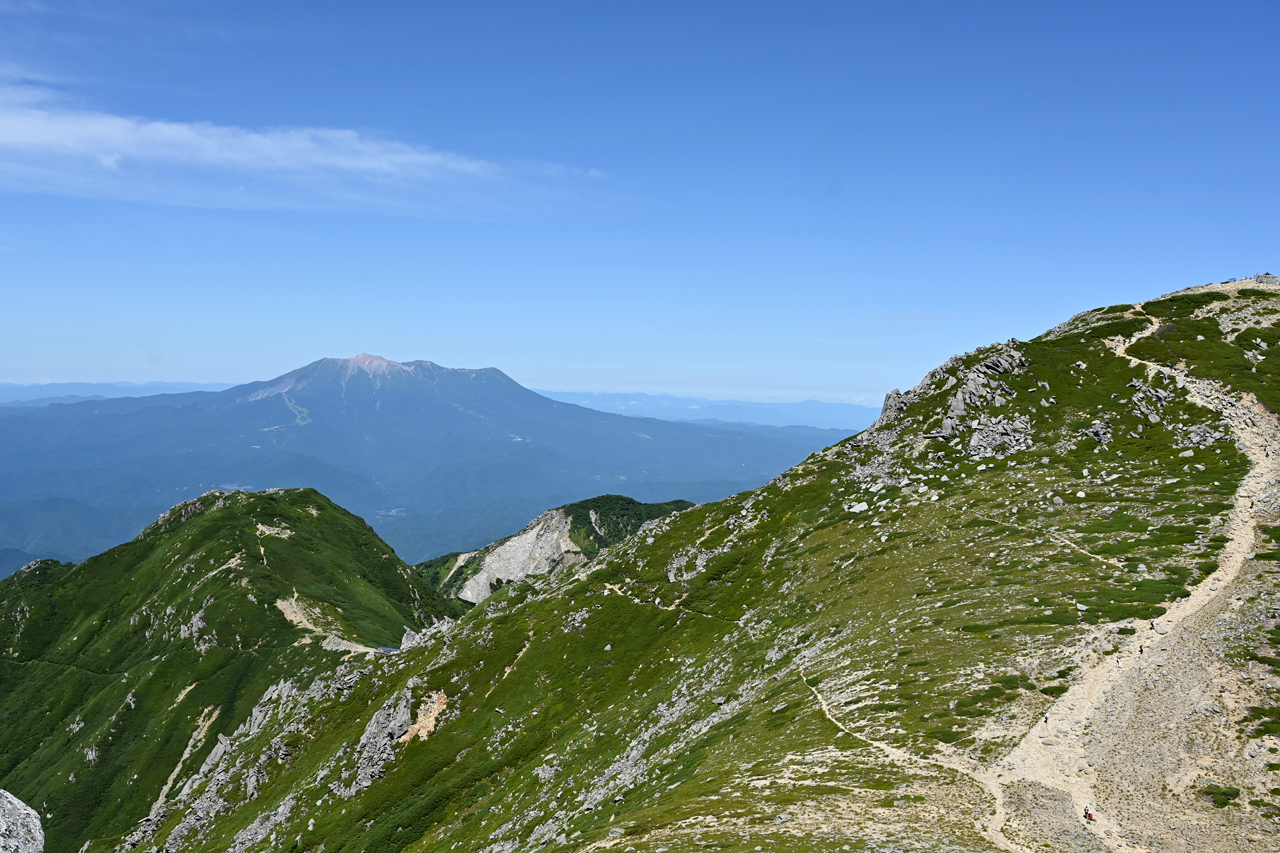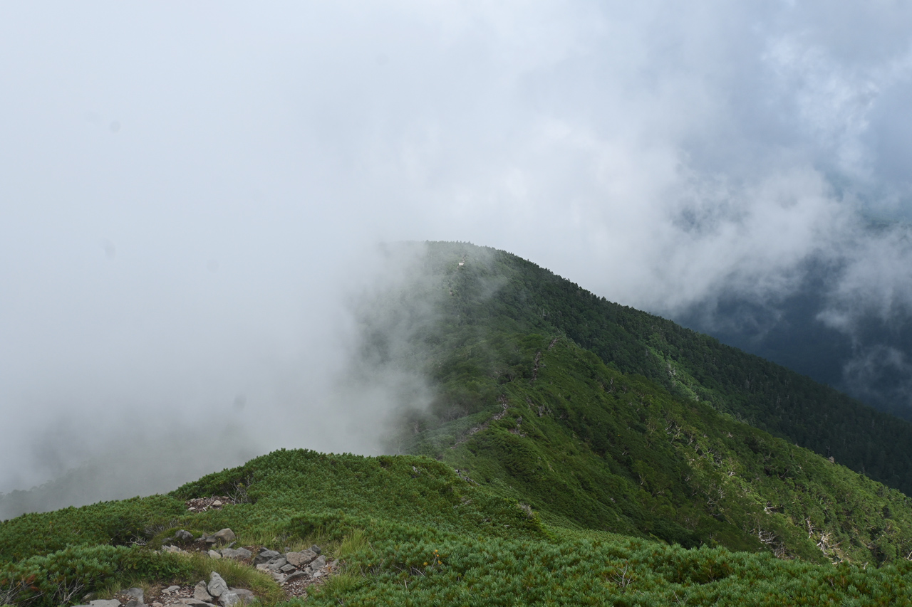 避難小屋から大岳に登る途中から歩いてきた赤倉岳と井戸岳 このあたりだけガスが切れている
