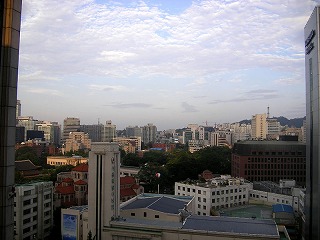 目が覚めてカーテンを開けるとソウルの街が広がっている。天気予報では旅行期間中ずっと傘マークのオンパレードであったが、昨日に続いてどうやら今日も天気は持ちそうな感じがする。もっとも戸外を歩き回る旅行者にとって、あまり日差しが強すぎるのは勘弁願いたいところだが。 |