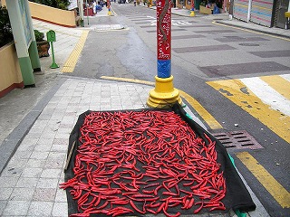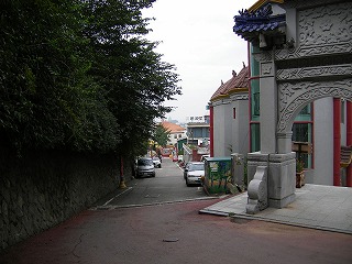 恐らく世界中どこの中華街でも共通であろうデザインの門をくぐる。時間がまだ早いせいか静かな街並みだ。歩道に遠慮なく広げられて干されている唐辛子が誠に色鮮やかだ。急な階段を登り、振り返るとインチョンの街並みが落ち着いた佇まいを見せる。