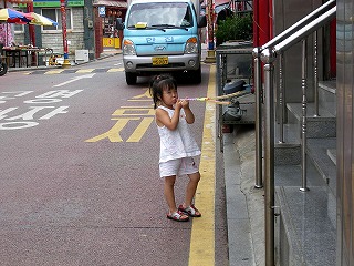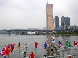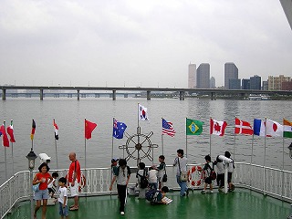 ヨイナル駅で降り、セミの声降りしきるなか、朝の強い日差しを浴びてハンガン(漢江)遊覧船の発着場まで歩く。もう既に汗だくだ。どうも先ほどから歩いているのは我々だけと思ったら、遊覧船は11時からだという。私の準備不足が露呈し、家内と娘の追求が厳しい。(^^;