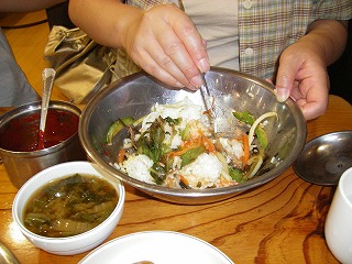 ビビンバはステンレスのボールに具材がドンと盛られてそれにご飯を自分で乗せてかき混ぜる。コチュジャンは好きなだけ入れて更にかき混ぜるべし。厚鍋で焼かれた日本の石焼ビビンバを期待すると、もはやこれは全く別の食べ物かもしれない。2年前に食べたビビンバは石焼ビビンバであったが、果たしてどちらが本当のビビンバなのか。ちなみに味の方はそこそこのようである。