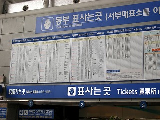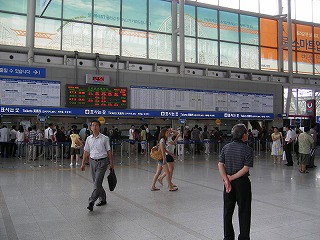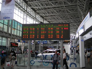 最近はKTX(日本の新幹線に相当)も開業し、首都の駅は流石によく整備されている。電光掲示板も自分レベルでも充分に内容を読み取れる簡潔さだ。これならば窓口で指定席券を買い求め、セマウル号(特急)やムグンファ(急行)号による列車の旅も可能だろう。KTXで釜山まで一気に行く旅もよいし、近郊へムグンファ号へでかけるのも良い。また、案外評判の良い長距離バスの客になるのも次回の目標である。